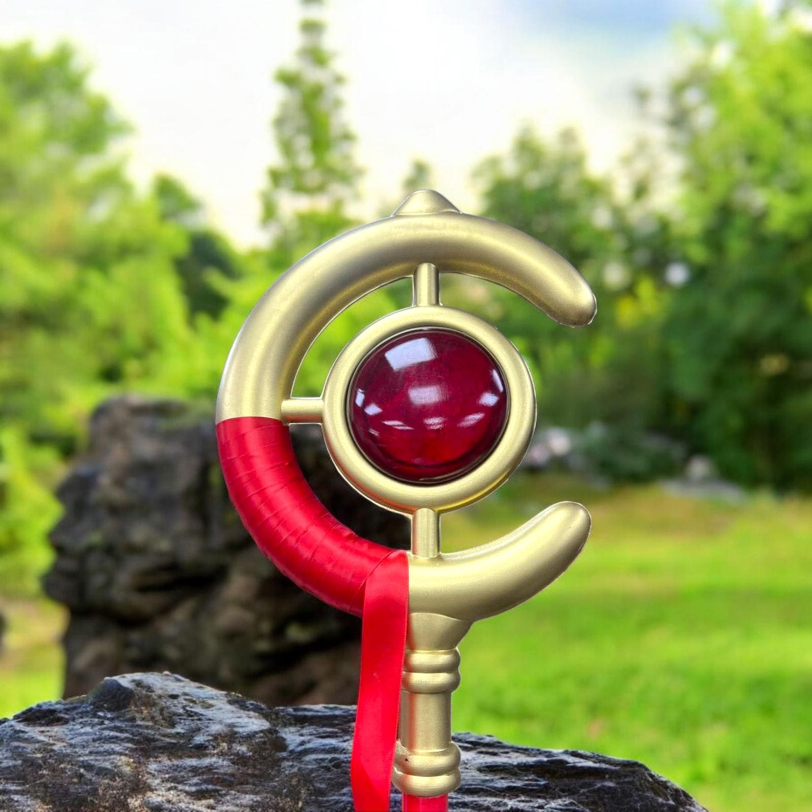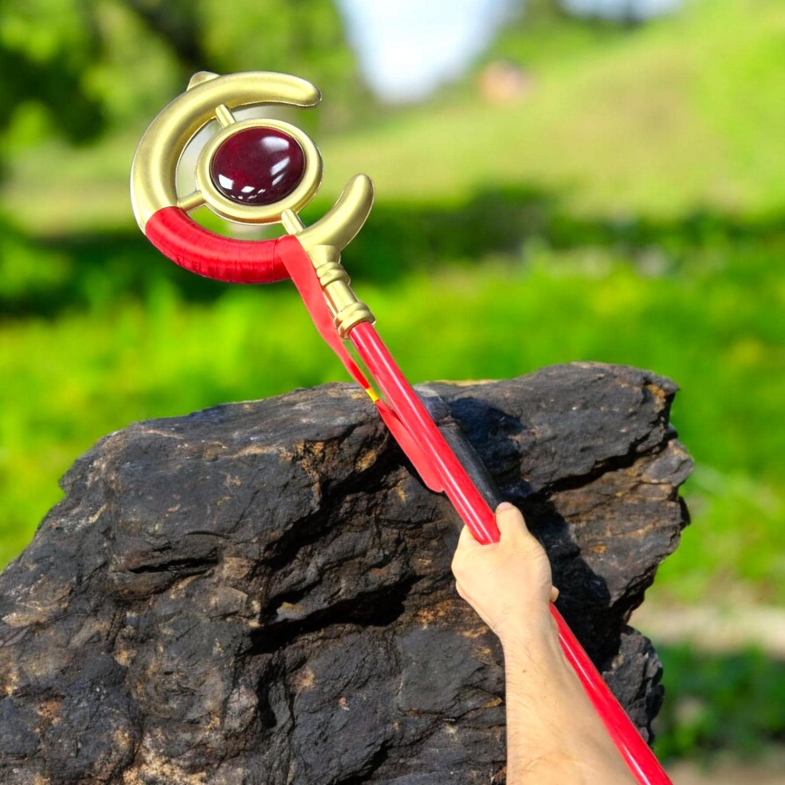 High-density PVC shaft, painted and clear-coated for durability. The piece is intentionally lightweight (under 1.2 kg typical) so convention wear and photo shoots are comfortable all day. Sections are threaded and key-locked so there is no wobble once assembled.